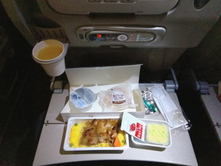 飛行が安定したころに機内食。選択の余地はなく焼き鳥丼。そのほかに卵豆腐とワッフルがついている。飲み物はオレンジジュースをもらう。アシアナ航空だが、いつものコチュジャンのチューブではなく袋に入ったコチュジャンが提供されている。せっかくなので全部使う。